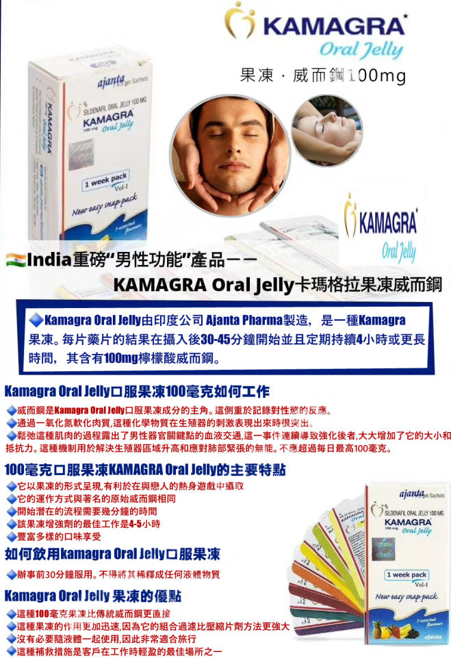 液態果凍威而鋼(Ajanta Kamagra Oral Jelly 100mg) 是全球首款液體威而鋼,在台灣市場常被稱為「果凍威而鋼」。因其多種水果口味與快速起效,也常被稱為「速效威而鋼」或「水果味威而鋼」。