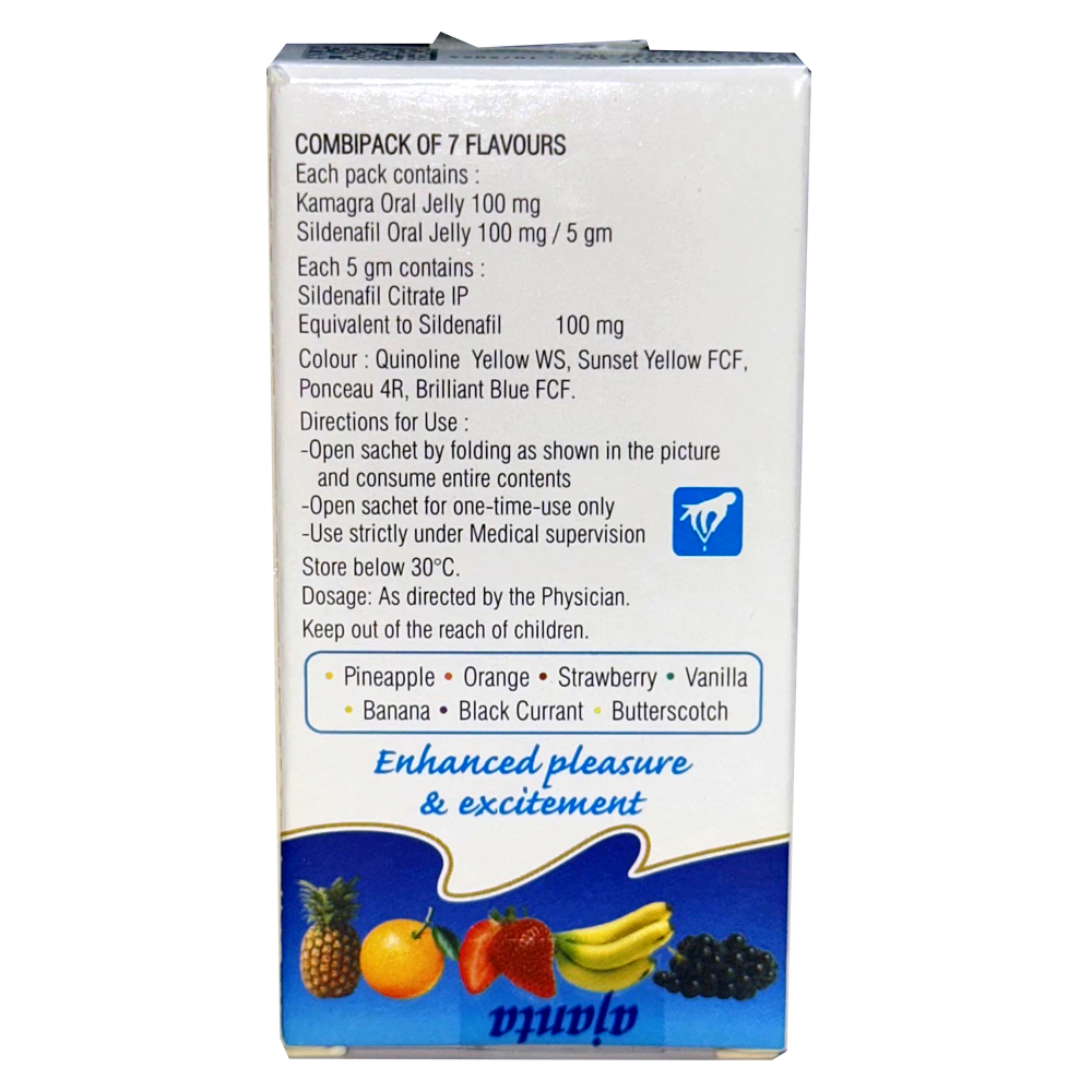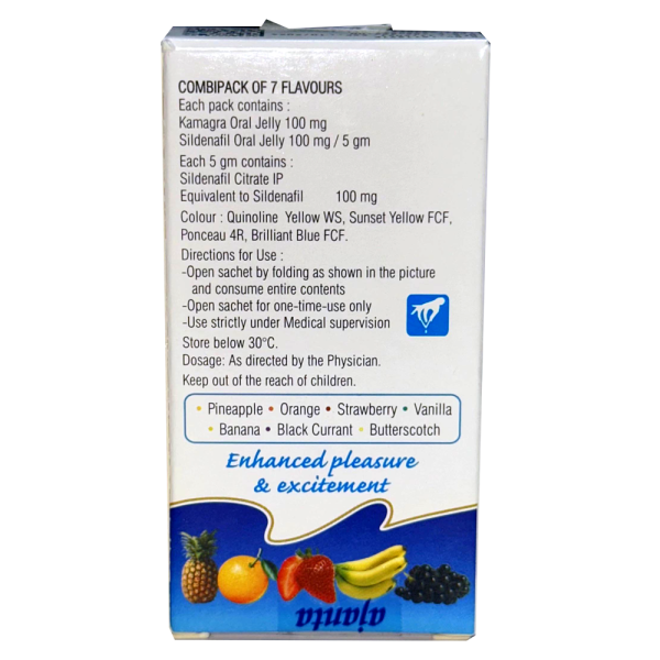 - 用法用量:每包含 100mg。打開包裝後,將果凍擠入口中,吞服全部內容。Kamagra 果凍 15-30 分鐘內被人體吸收,藥效可持續 4-6 小時。每日最多服用一次。