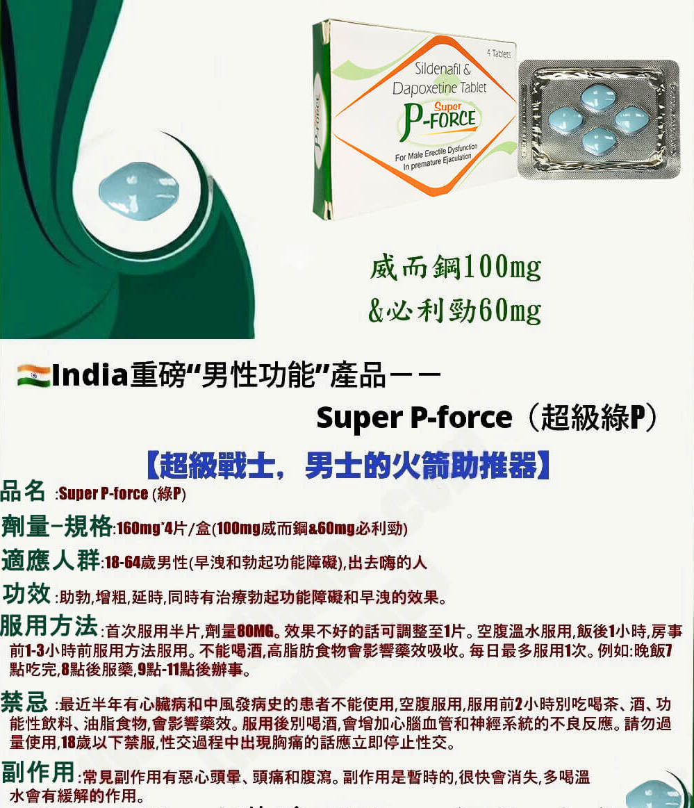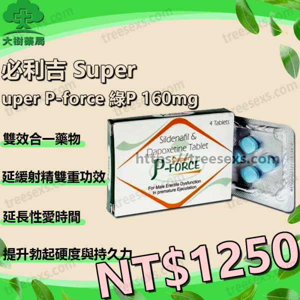 綠P 必利吉 Super P-Force 160mg 是針對同時有勃起與早洩困擾男性的高效雙效藥物。結合強力助勃與延時作用,讓您在性愛中持久堅挺,重拾自信與激情。